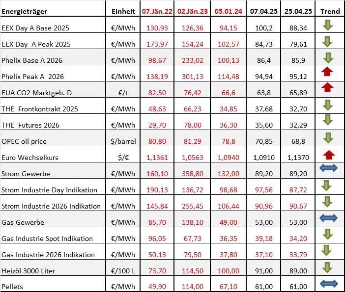 Für Wirtschaftlichkeitsbetrachtungen sind aber nicht nur die Energiepreise ausschlaggebend. Einmalige Umstiegsrabatte für Gewerbe sind bei Stromtarifen (20.000kWh) und Gastarifen (50.000 kWh) berücksichtigt.Den Strompreisen-Industrie liegt ein Base/Peakverhältnis von 70/30 % zu grunde.Die dargestellten Preise sind indikativ und beinhalten keine Netzkosten, Steuern und sonstige Abgaben.